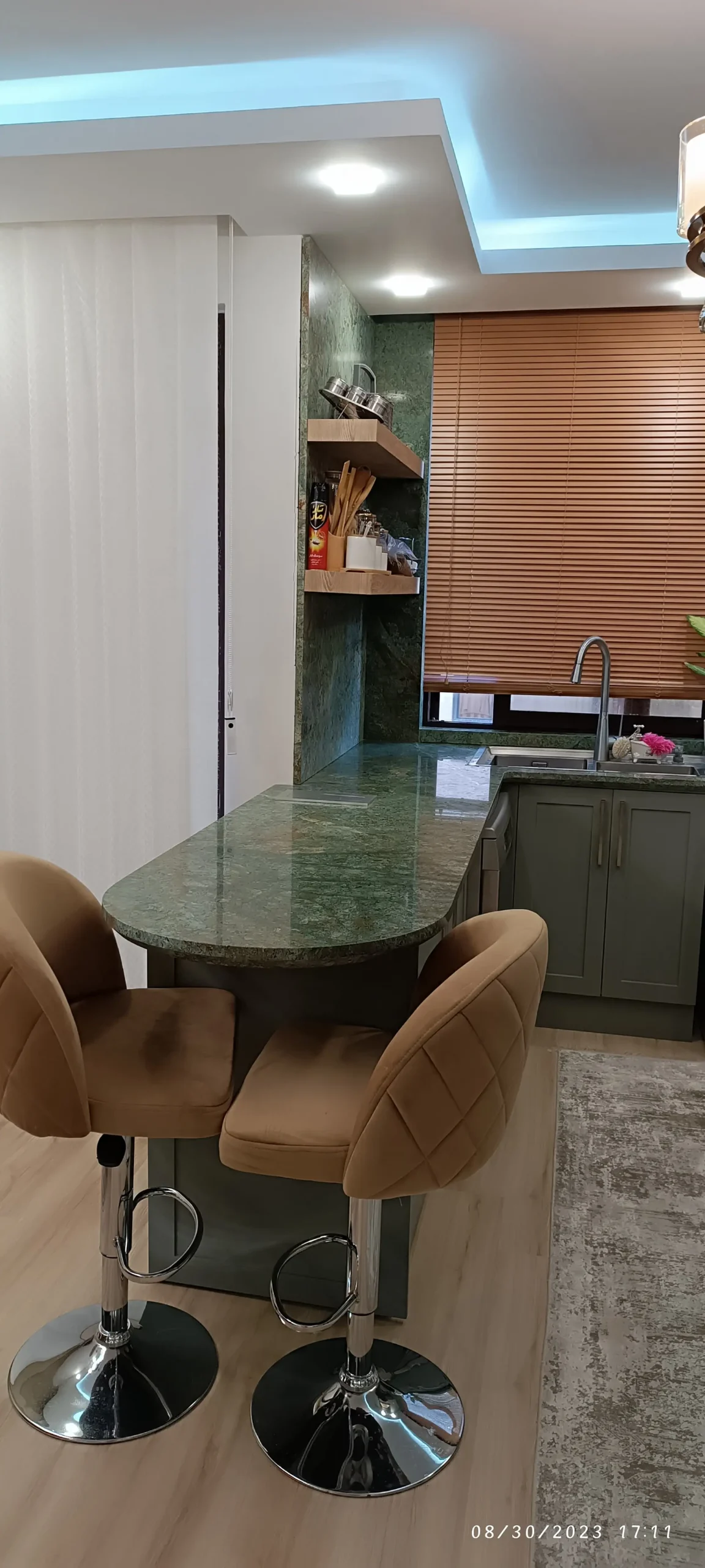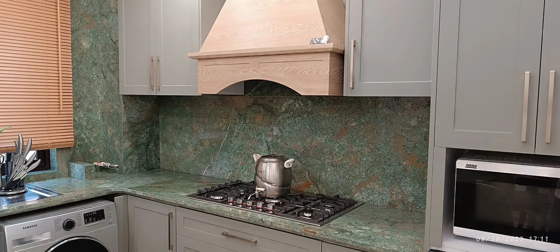 100 درصد%در این پروژه سطح صفحه روی کابینت آشپزخانه با استفاده از گرانیت مشکی نطنز پوشش داده شده است. این سنگ با مقاومت حرارتی بالا، بهترین گزینه برای استفاده در آشپزخانههای خانگی و صنعتی محسوب میشود. سطح نهایی کاملاً صیقلی و براق بوده و لبهها با ابزار «پولیش لب گرد» برای جلوگیری از لبپریدگی پردازش شدهاند.
